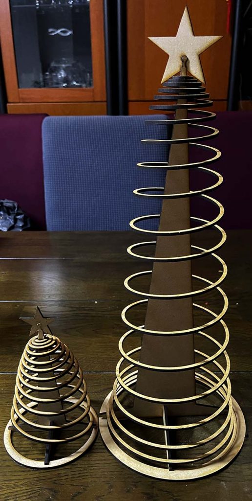 Here is an example – a Christmas Tree DIY edition. You can paint it or not, glue decorations and best of all they occupy little space (small one is about 15cm tall there is a large one that is 40cm tall as well). Better still contact us and for a small fee we can engrave names or whatever else you like on the spiraling tree!